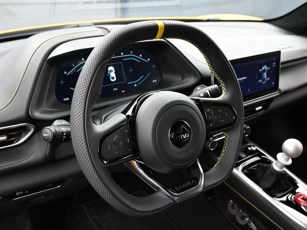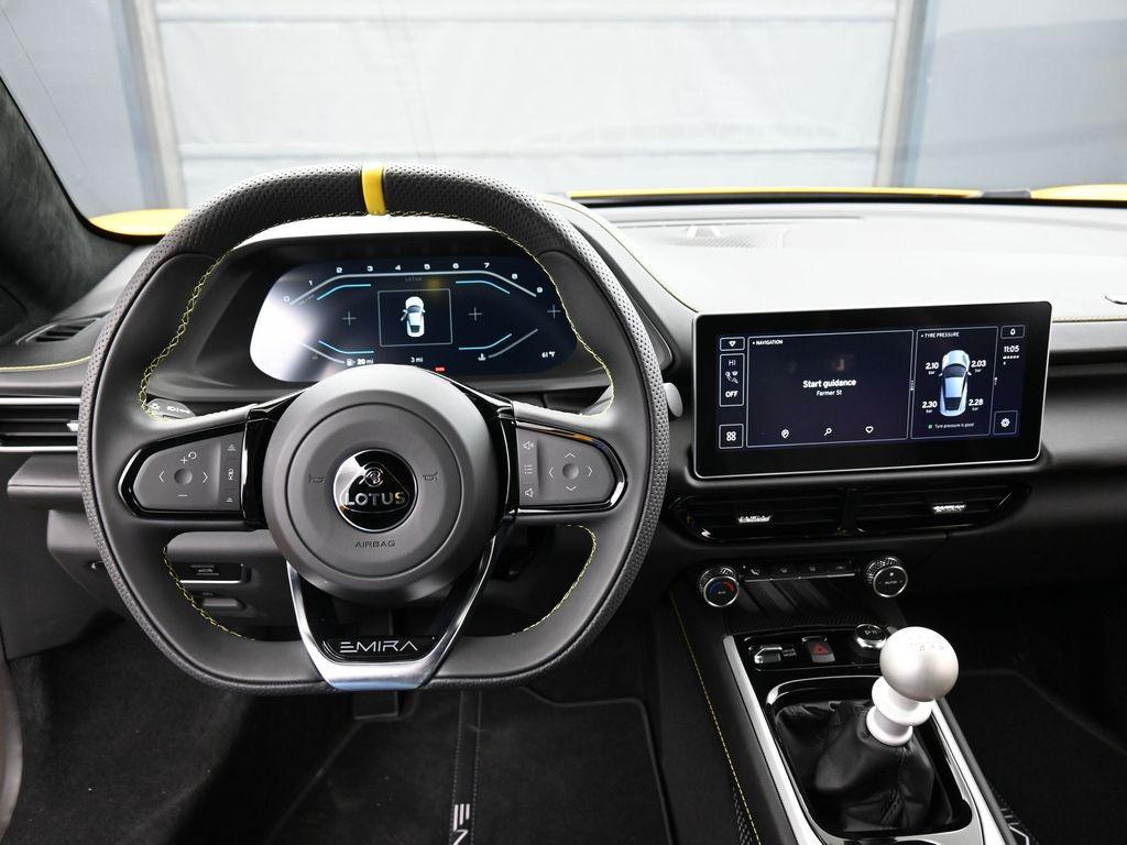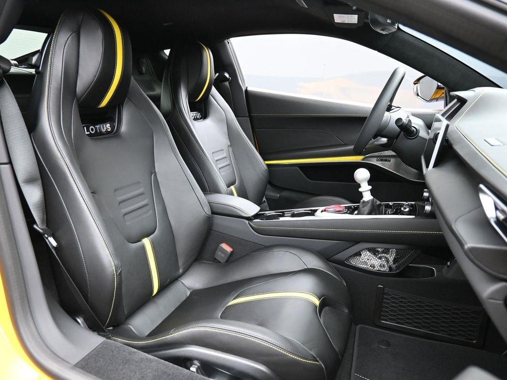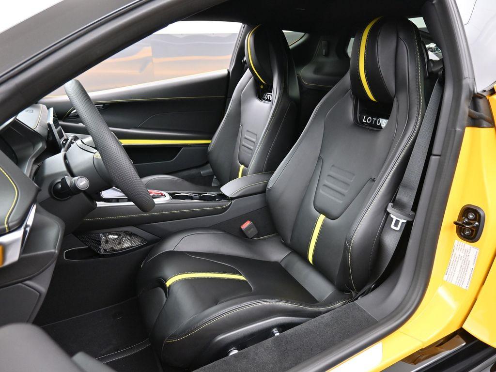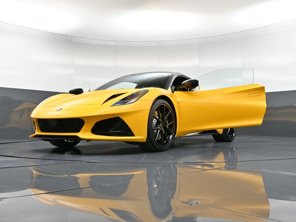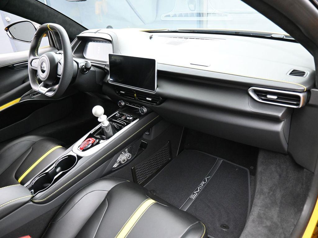 2026 Lotus Emira V6 SE-Hethel Yellow / Black leather with Yellow accents -Black leather steering wheel with Yellow TDC and Stitching -Sport Suspension-Full Black Pack-Black Brake Calipers-20 Inch V Spoke Ultra Lightweight Gloss Black Wheels-Black Leather with Yellow Accents Interior Materials-Black Leather Steering Wheel with Yellow TDC and Stitching-Alcantara Headliner-Black Seat Belt-Black and Silver Nose Badge and Center Caps-KEF Premium Audio-Goodyear Eagle F1 Supersport-12 way adjustable, heated seats-Wireless Apple Carplay and Android AutoRecent Arrival!